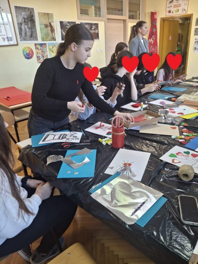 Učenici su imali priliku upoznat lim, kao materijal pogodan za oblikovanje i modeliranje ,te su kroz igru niskog i uleknutog reljefa stvarali obrise srca, a neki su dizajnirali i naušnice. Također smo se igrali i kolaž tehnikama, te na temu srca stvarali slike različitih kompozicija.