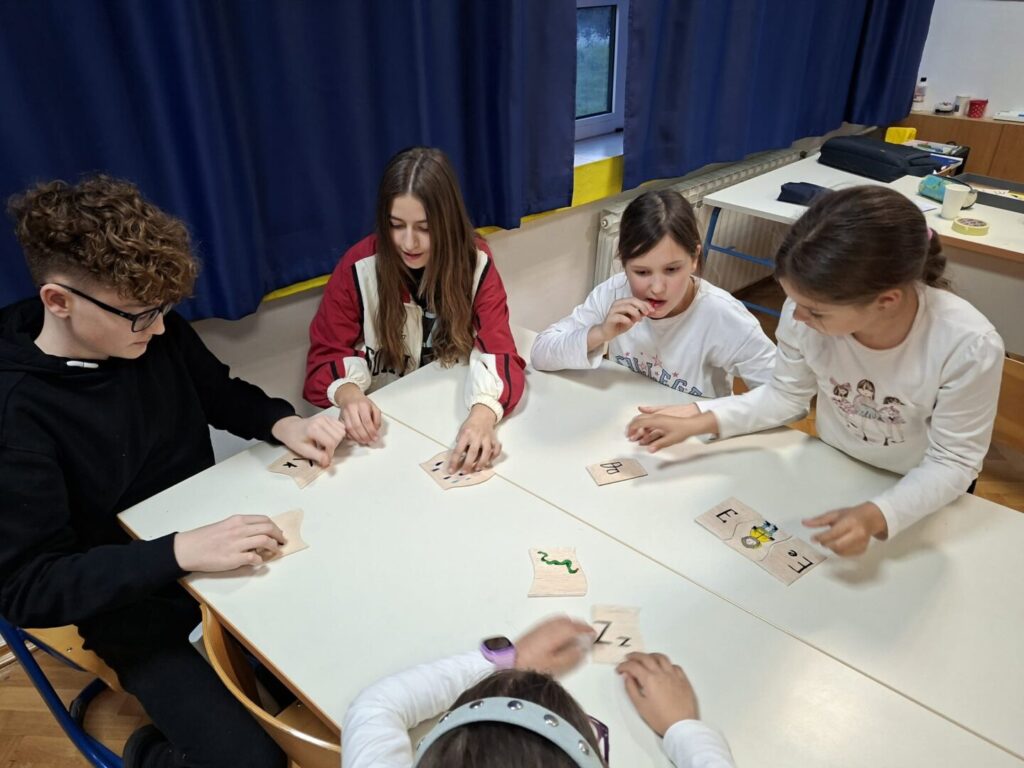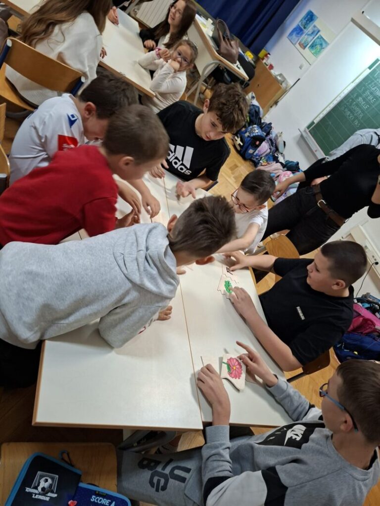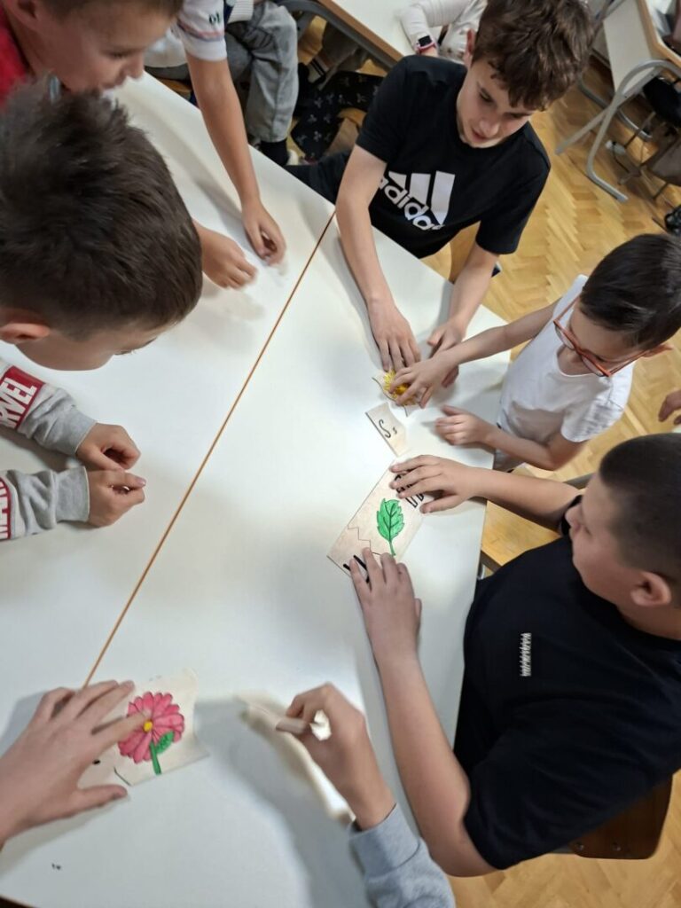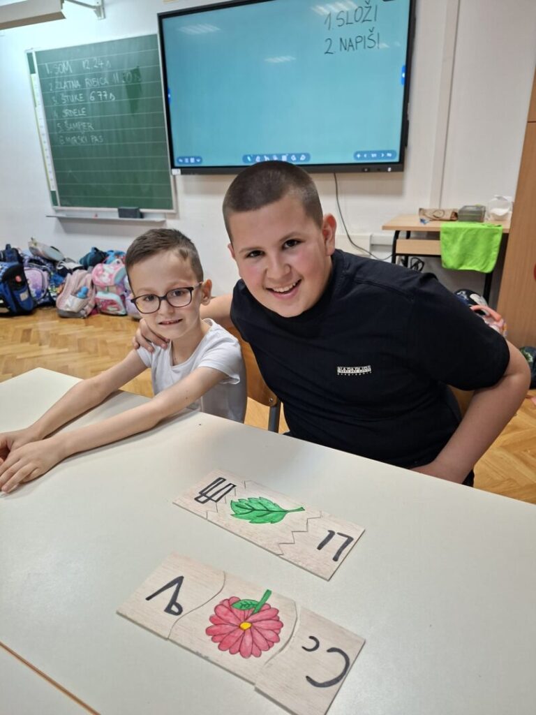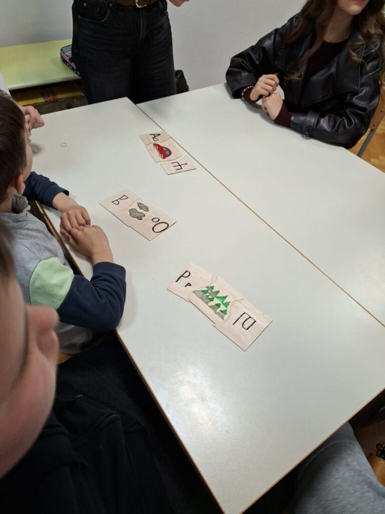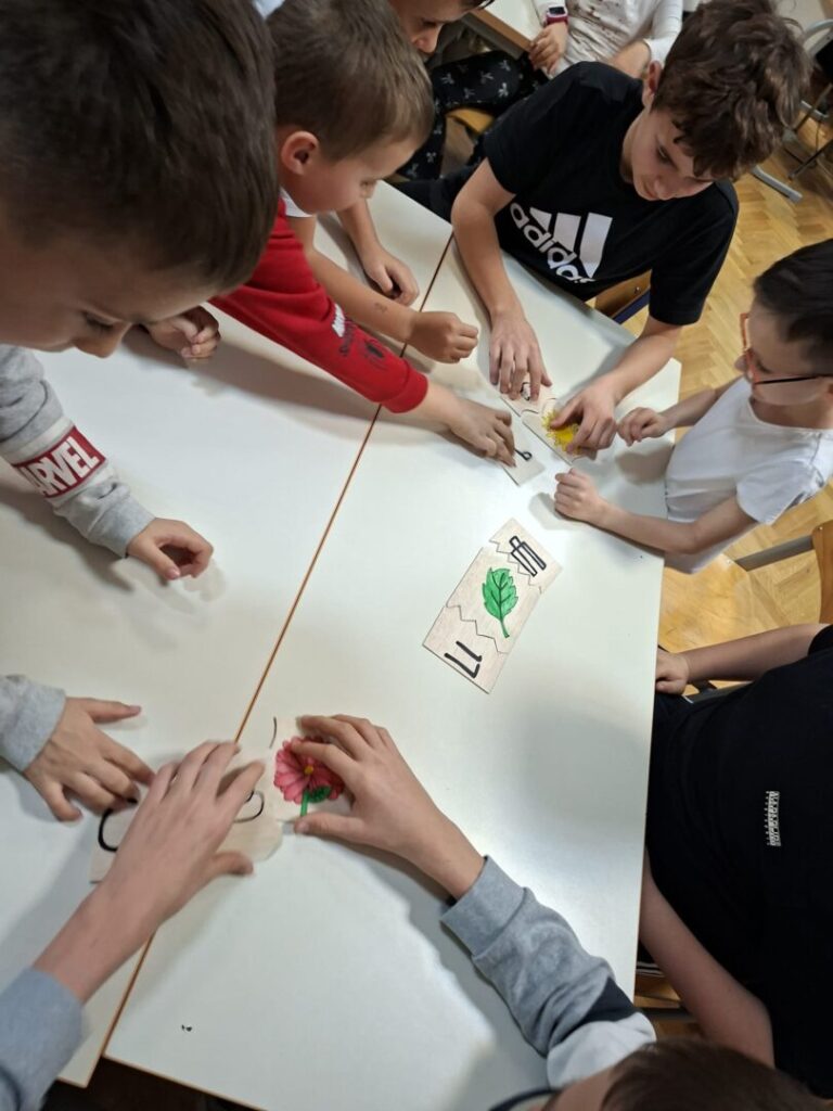 Našu čarobnu, drvenu kutiju isprobali smo i u praksi. Učenici 7.a razreda i 1. a rasporedili su se u timove vrlo zanimljivih naziva koje su sami odabrali: Zlatne ribice, Somovi, Štuke, Srdele, Šampjeri i Morski psi kako bi u što kraćem vremenu složili zadana slova. Svaki je tim dobio po 4 dijela slagalice kojeg čini par latiničnog slova, crteža s prikazom riječi koja započinje tim slovom i glagoljičnog slova. Učiteljice su štopericom mjerile vrijeme svakom timu potrebno za pronalaženje i slaganje odgovarajućih parova, a rang lista s najkraćim prolaznim vremenom je bila presudan čimbenik da 3 najbolja tima nastave daljnji tijek natjecanja.