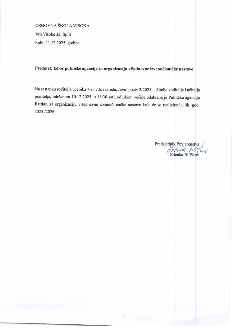 Odluka o izboru putničke agencije za organizaciju izvanučioničke nastave